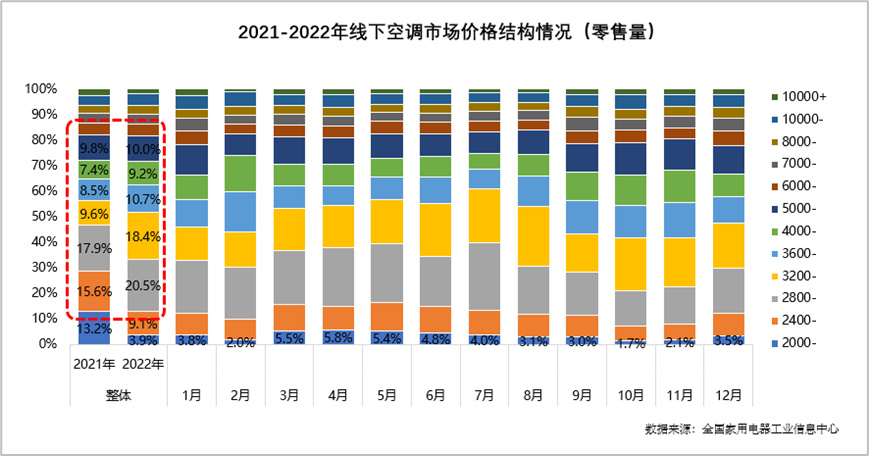另外由于消费受到影响,2022年高端产品的零售量份额有所下降,比如5000元以上变频挂机和12000元以上变频柜机,市场份额呈现缩小。