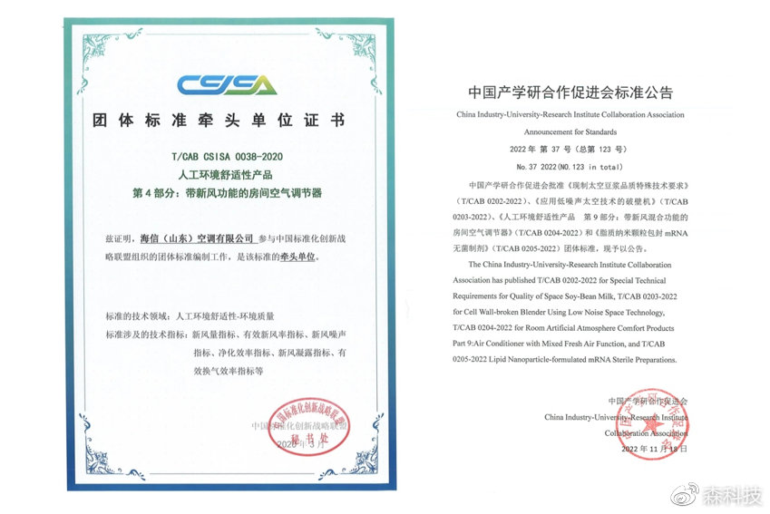 2020年,海信牵头制定新风空调团体标准——《房间空调器新风功能评价规范》,这是中国家用空调领域首个开始制定的新风空调行业标准;2022年4月,海信空调与中国家用电器研究院联合发布了《新风增氧健康空调评价技术规范》,该技术规范进一步提升了对产品新风量、净化效率、新风噪声、置换效率等性能的要求;2022年11月,中国产学研合作促进会发布标准公告,宣布海信空调研发团队制定的《带新风混合功能的房间空气调节器》团体标准——即新风混风团标批准通过。这是行业内首次提出混风风量、混风室内污染物去除率的概念。新风混风团标的制定,建立了新风混风功能的技术要求和试验方法,实现了功能和技术上的双重跨越。